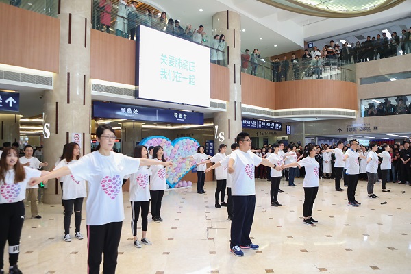 今天上午,一场院士带领下的关爱“蓝嘴唇”快闪活动在复旦大学附属中山医院东院区门诊大厅举行,小提琴独奏、合唱、心脏康复操,节后首个工作日一早来院就诊的患者收获了一场惊喜的视听盛宴。“20多名医务人员在葛均波院士的带领下一同脱去白大褂,换上印有蓝嘴唇的服装‘翩翩起舞’,“这场快闪活动真的别出心裁!”罹患肺动脉高压多年的张女士感慨,感谢医务人员对自己和病友的关爱,希望社会、公众能够给肺动脉高压患者更多的支持、理解和关注。
